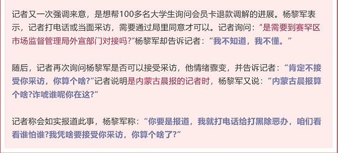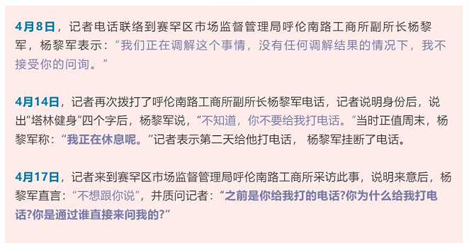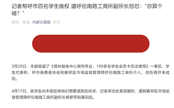 这场基层官员和本地媒体的“冲撞”,的确来得剧烈,但起因并不复杂:4月18日,内蒙古晨报公号刊发了《记者帮呼市百名学生维权 遭呼伦南路工商所副所长怒怼:“你算个啥?”》的报道,称其曾于3月29日报道了“塔林健身中心突然停业,100多名学生会员卡无法使用”一事,此后作为属地监管部门的呼伦南路工商所介入协调。之后记者追踪此事,却接连在该工商所副所长杨黎军那“碰壁”。