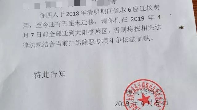 ▲江西上饶广丰区下溪街道柳坞社区发出的告知单,警告村民如不限期迁坟,将“按相关法规结合扫黑除恶专项斗争依法制裁”。当地之后为此道歉并启动问责。图片来源:新京报。