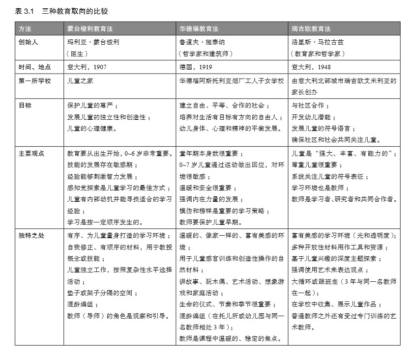 这三种取向如今会受到重视是不奇怪的。因为每一种方法都集中体现了对儿童及童年期本身的尊重和重视,塑造了几个世纪以来的学前教育。每一种方法都在许多方面和我们今天强调的发展适宜性实践理念相一致。