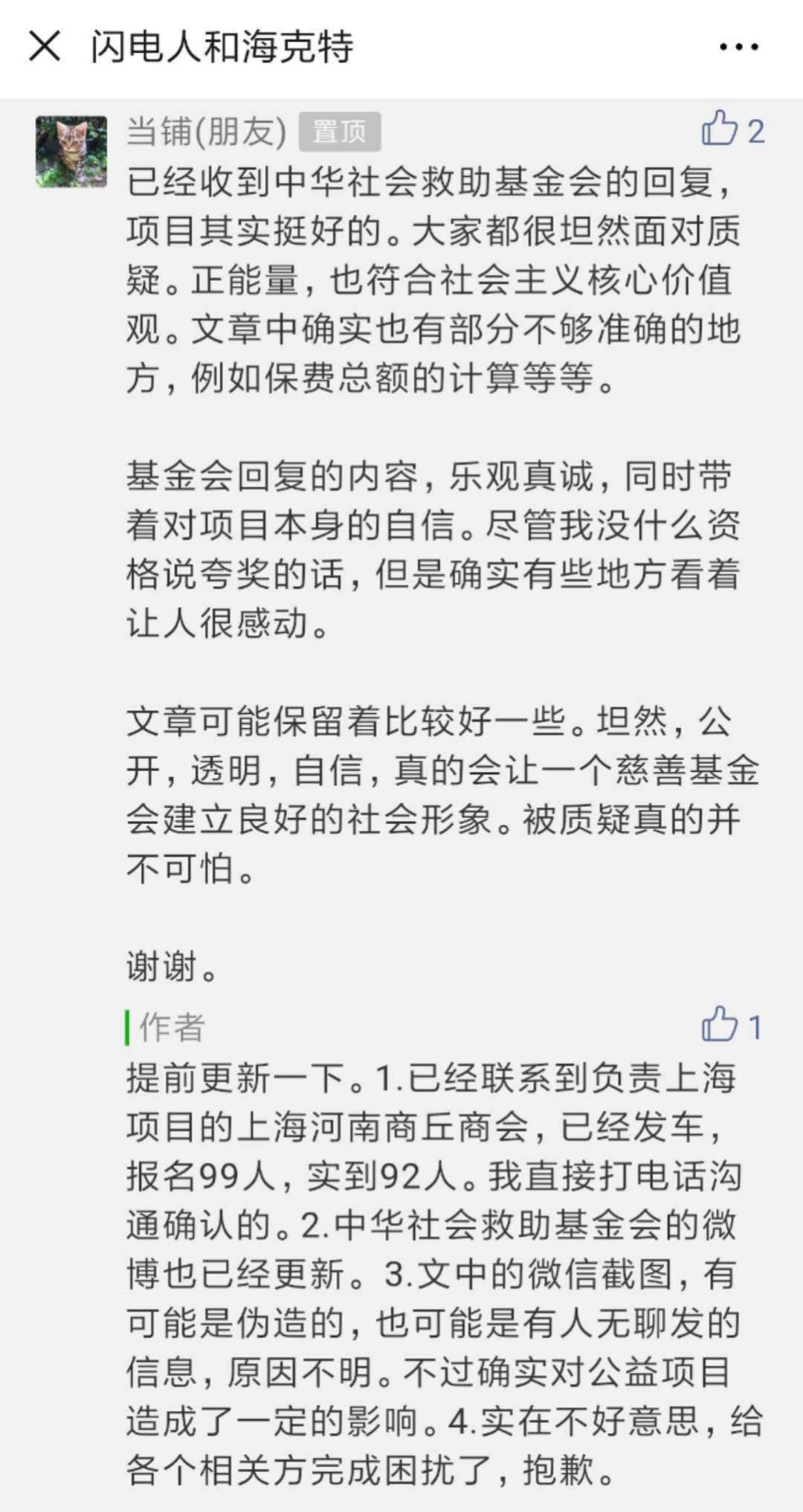 实际计算起来,保费应为19.9万元。发布上述文章两天后,“dangpu”再发文澄清,强调活动“真实可信”,并附上了中华社会救助基金会相关负责人的回复,比如保费拟定是20万而非200万。并且,他在原文下方也留言作了说明,“项目挺好的,大家都很坦然面对质疑。”
