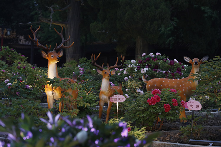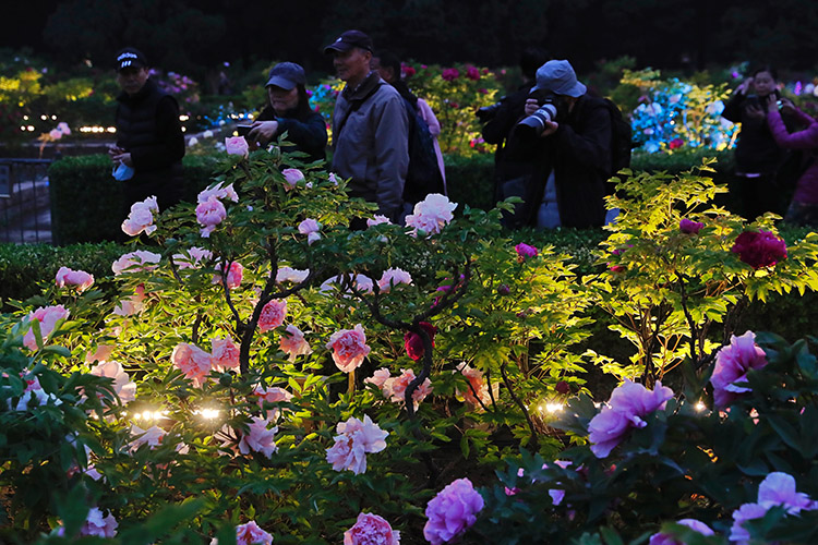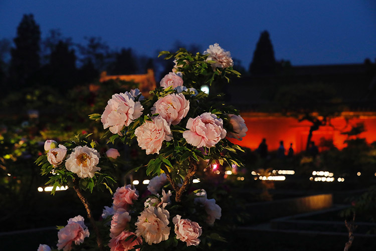 晚6点半,夜赏灯光亮起,夜色中勾勒牡丹的轮廓。