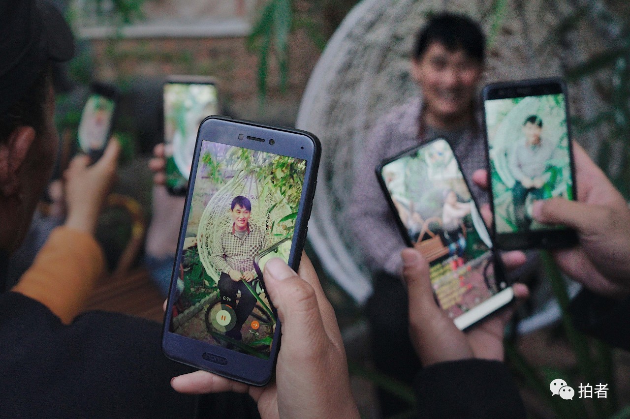 △朱之文在自家院子朝着一排手机摄像头僵笑。手机画面里,朱之文被“磨”了皮,“涂”上了口红。