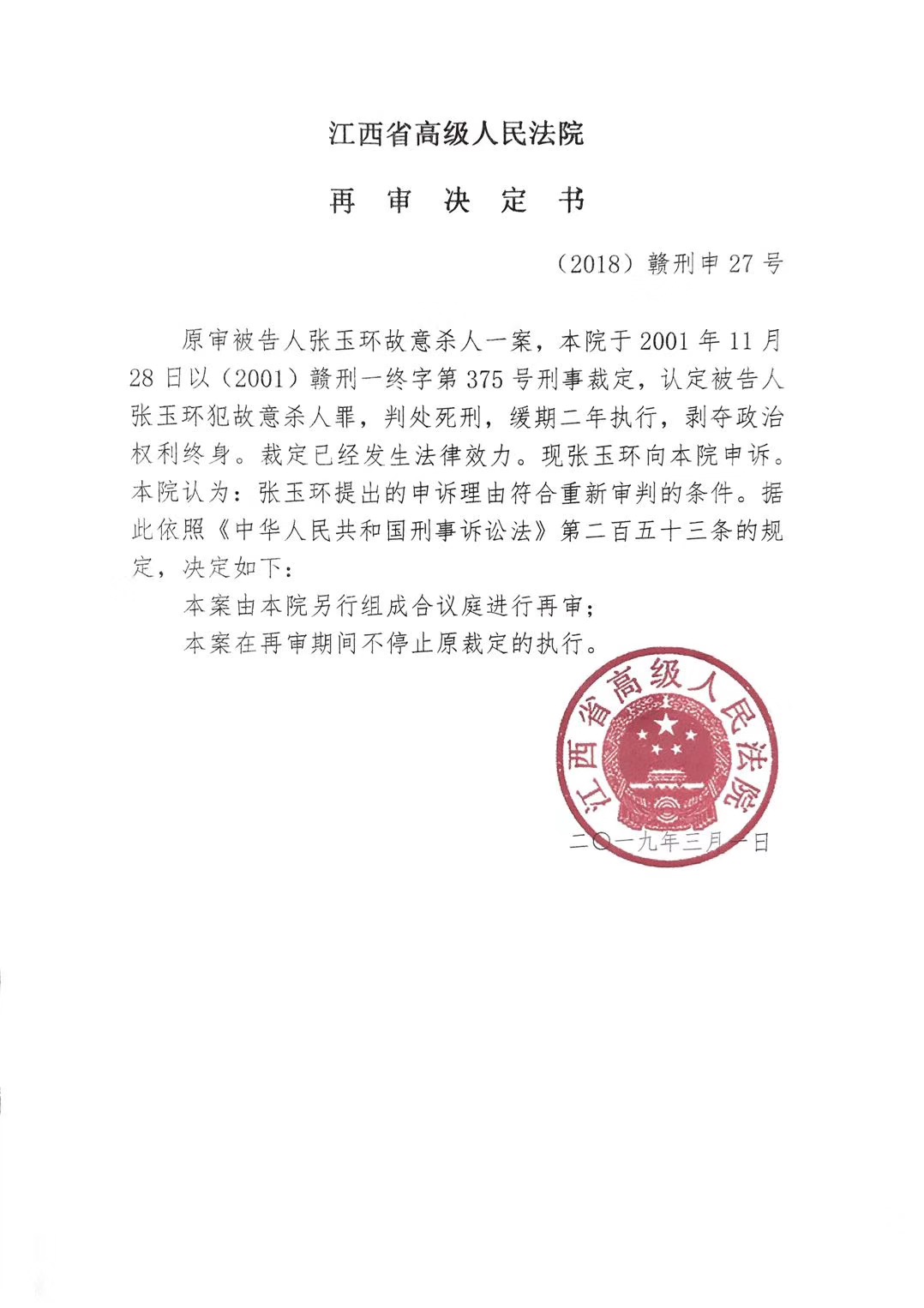 1995年1月26日,南昌中院一审以故意杀人罪判处张玉环死刑缓期2年执行。该案此后曾被江西高院发回重审。2001年11月28日,江西省高级人民法院作出终审裁定,驳回上诉,维持原判。终审判决后,张玉环被送往监狱服刑。2019年3月,江西高院决定对张玉环案再审。