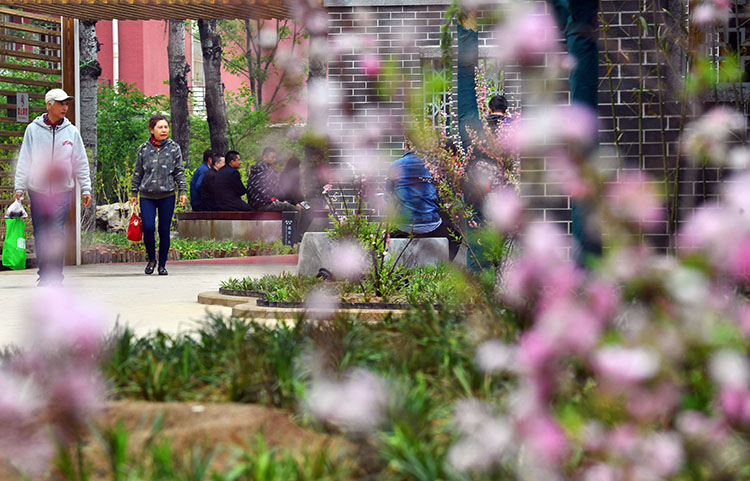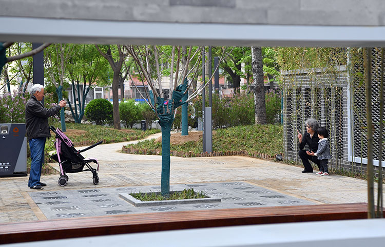 居民在大兴滨河街林荫慢行步道边取景拍照。林荫慢行系统打造了集“实用、景观、文化、休闲”多功能为一体的开放共享空间。