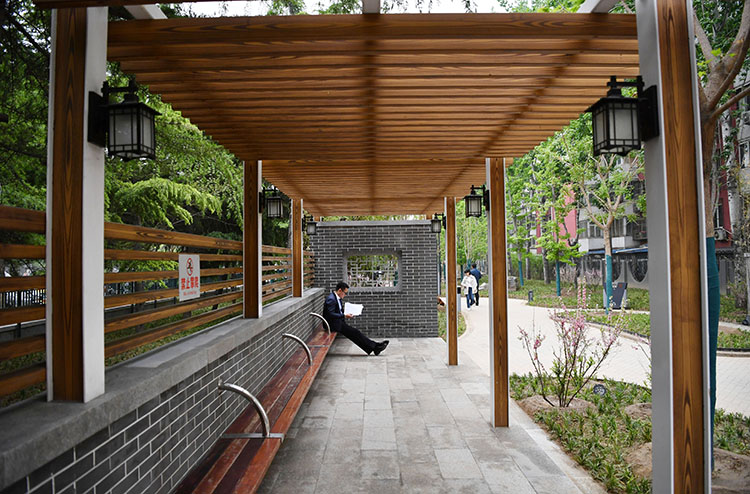 大兴滨河街的林荫慢行步道边增加了休憩场地。每条步道都布设座椅、垃圾桶、路名牌、草坪灯等城市家具。