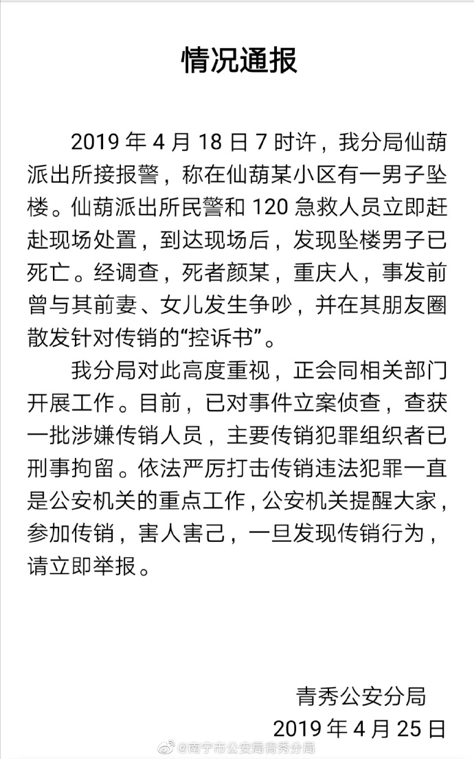 重庆一男子发传销控诉书后坠亡 主要传销组织者已被刑拘
