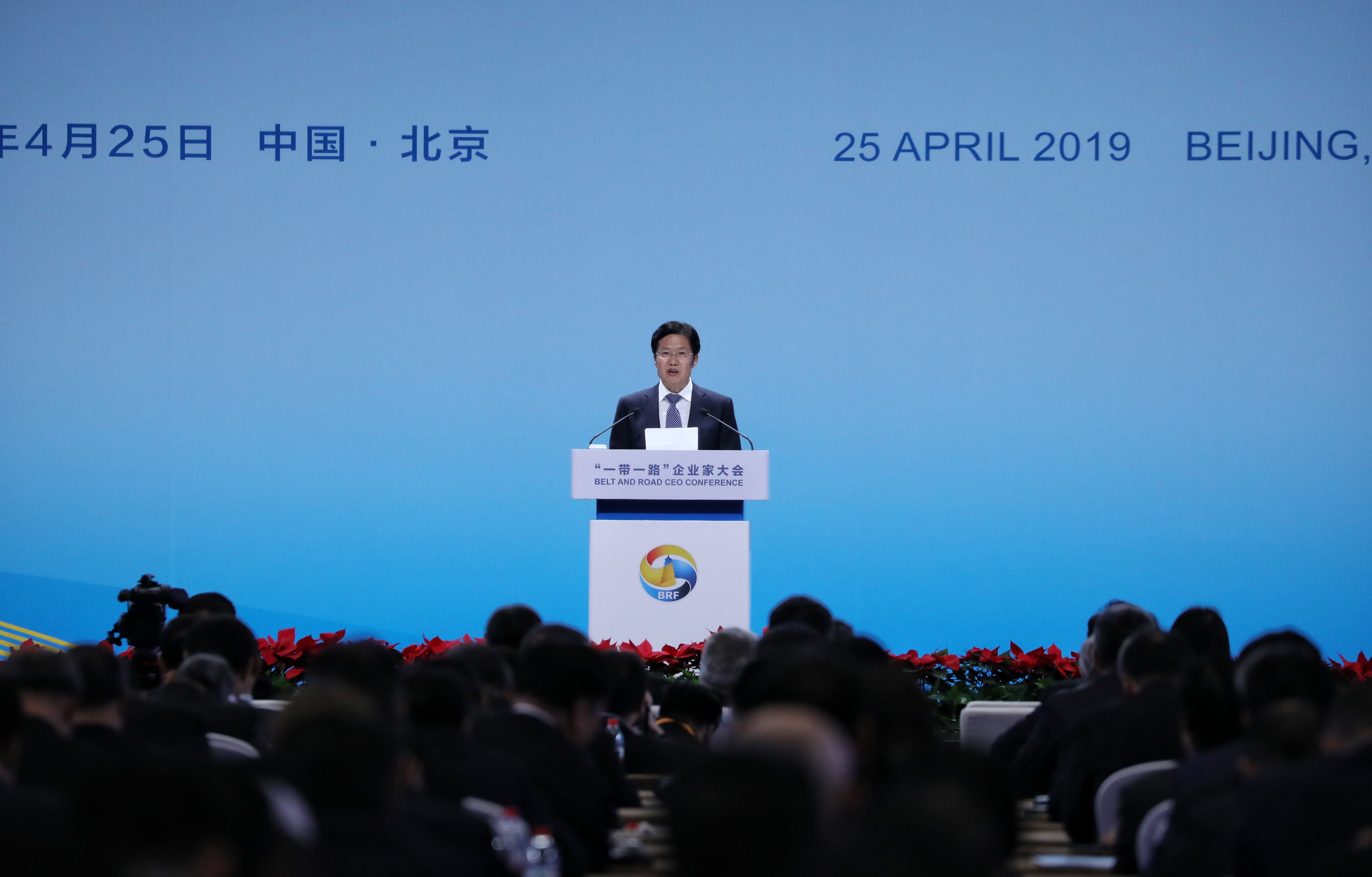第二届“一带一路”国际合作高峰论坛企业家大会上,全国政协副主席、全国工商联主席高云龙在发言。摄影/新京报记者 王贵彬