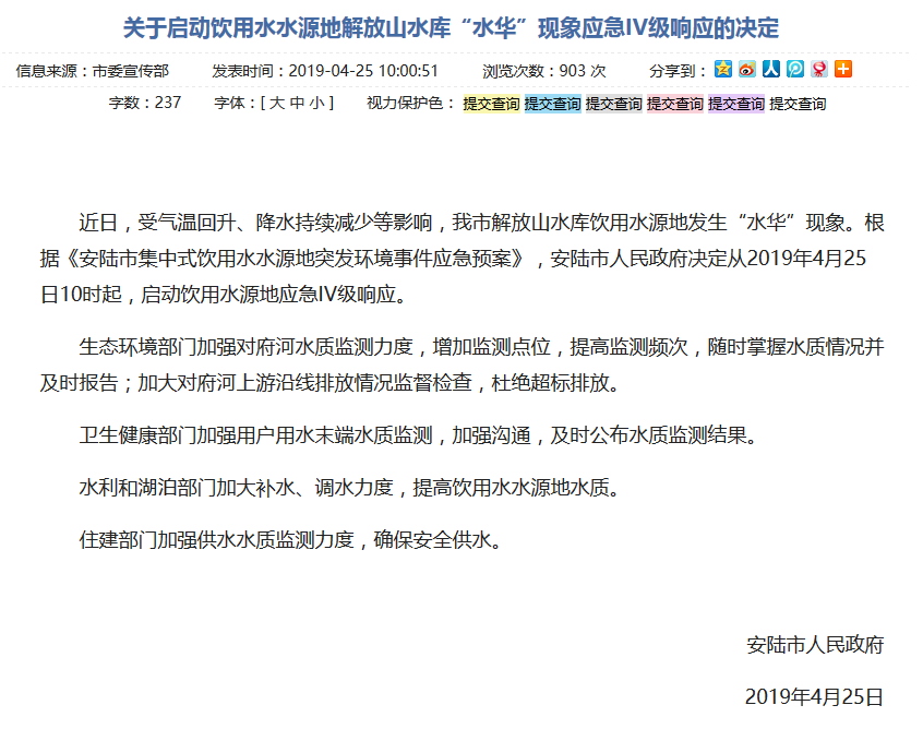 原标题:关于启动饮用水水源地解放山水库“水华”现象应急IV级响应的决定