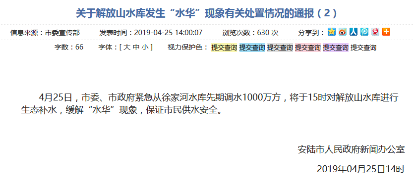 4月25日14时许,安陆市政府再次发布通报称,当地市委、市政府紧急从徐家河水库先期调水1000万方,将于15时对解放山水库进行生态补水,缓解“水华”现象,保证市民供水安全。