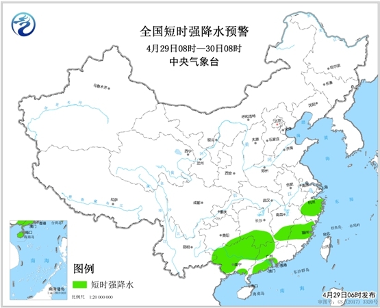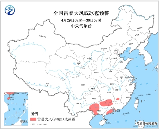 预计4月29日08时至30日08时,湖南南部、江西南部、广西西部和东北部、广东西北部和南部沿海地区等地局地将有8-10级雷暴大风或冰雹天气;贵州东南部、湖南南部、江西中南部、浙江中部、福建中部、广西、广东西北部和南部沿海地区等地的部分地区将有短时强降水天气,小时降水量20-50毫米,局地可达60毫米以上。