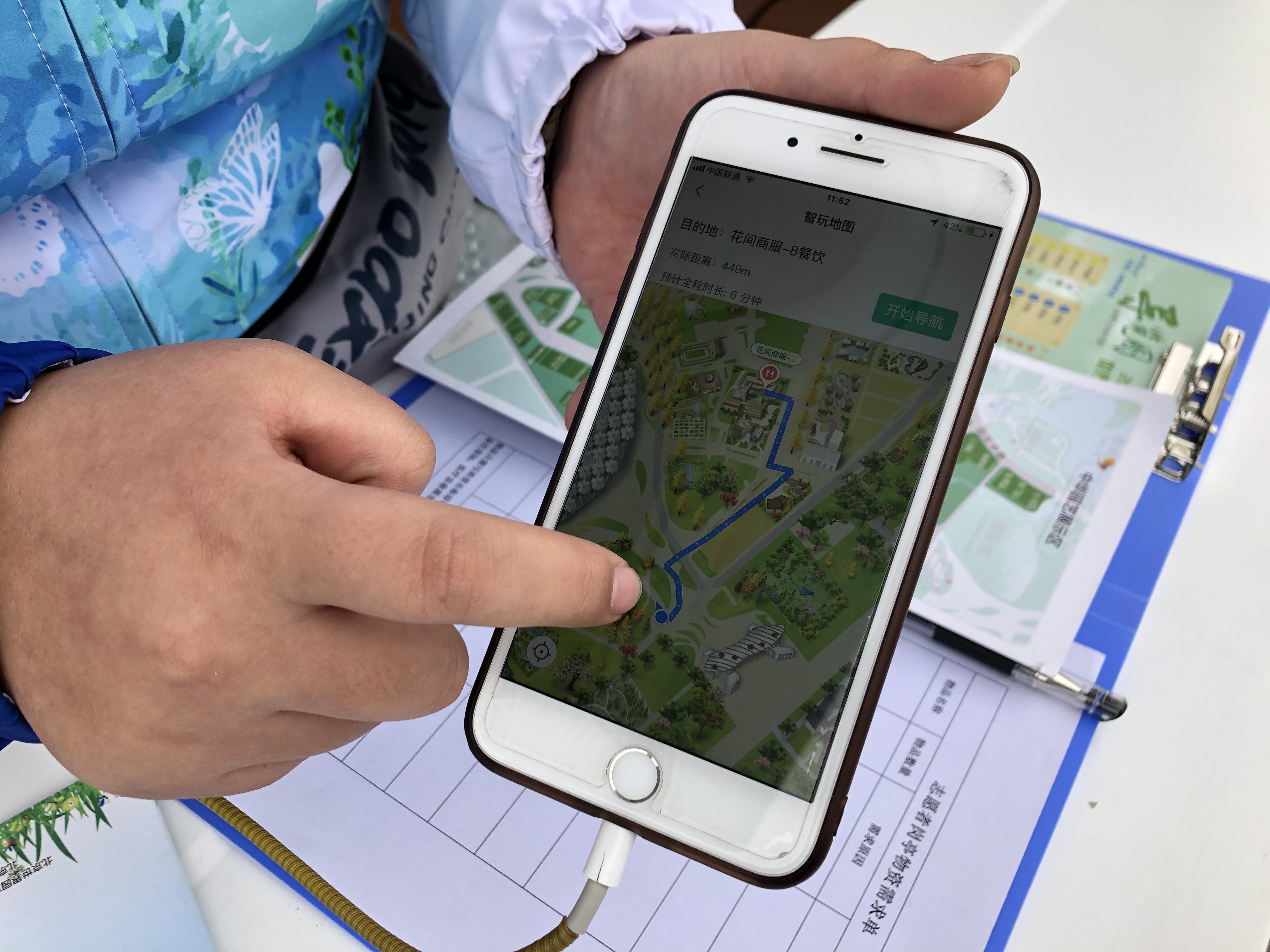 “我在指路的同时会建议游客下载一个‘智慧世园app’,对主要景区和游览路线都有介绍,打开app内的‘智玩地图’,全园的餐饮、卫生间、医疗、母婴室、电瓶车站等服务点位都有标注,还可以一键导航到最近的点位。”这名志愿者说。