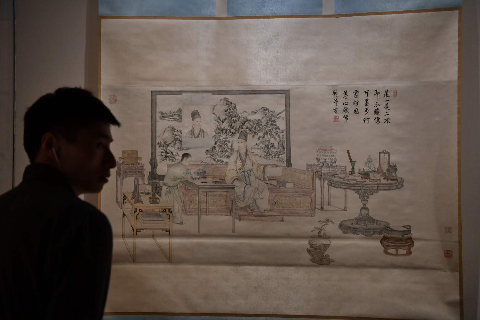 展厅第一单元里,乾隆帝“是一是二”图像轴被重点展示。图中,乾隆帝身着汉人服饰,一腿半趺坐于床榻之上,右手执笔,左手持纸卷,一副文士装扮。身后山水画屏风上,悬挂一幅同样容颜的半身画像。以这种“画中画”形式表现皇帝的肖像,在西洋画中是没有的,在中国历代皇帝中也仅乾隆帝一人。值得一提的是,故宫近年从家具馆藏中找出了这幅画中同款或近似家具,将整幅画中的陈设还原在南大库家具馆中。