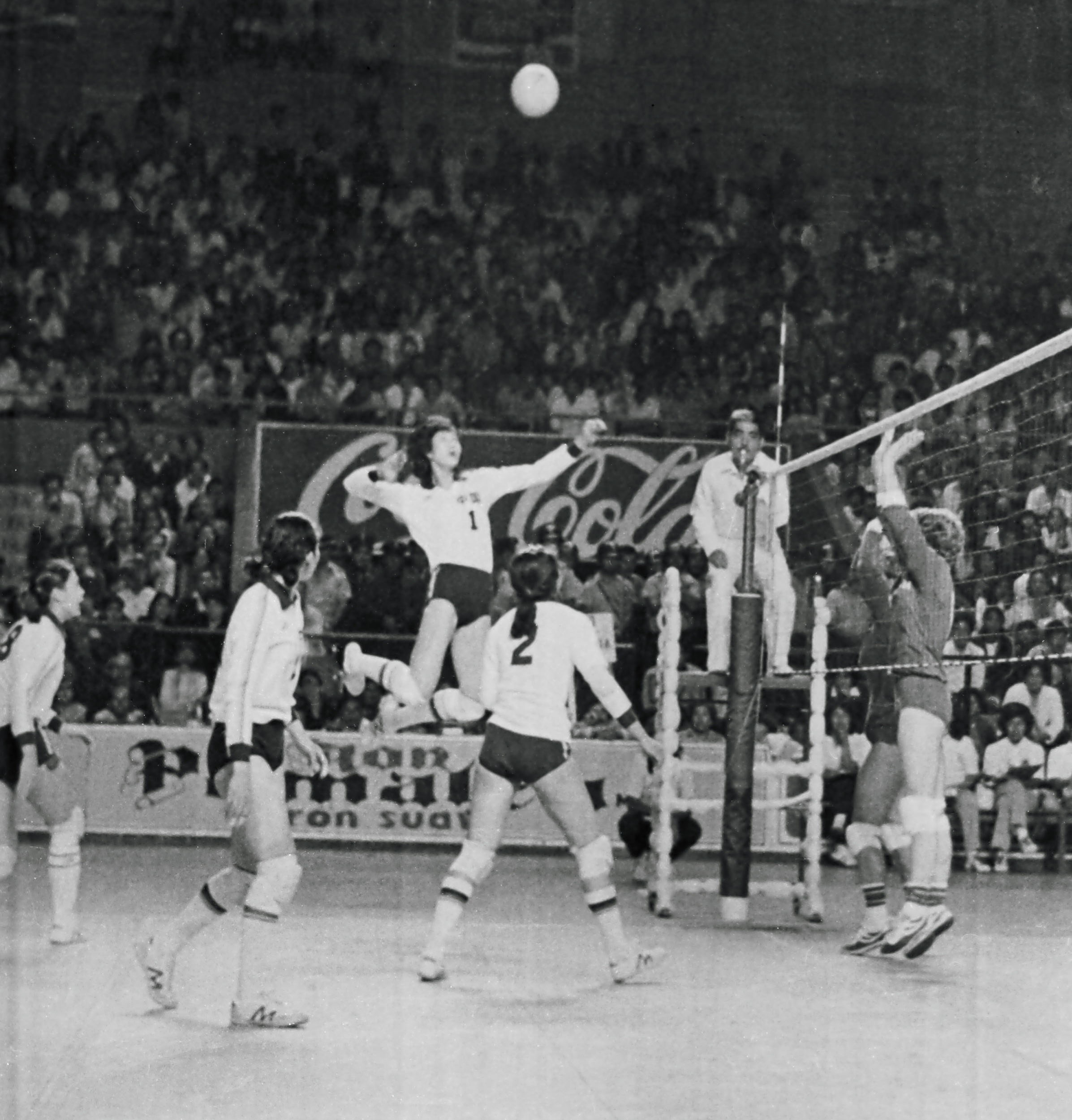1982年女排世锦赛,中国队夺冠。图为郎平4号位扣球。图/中国体育
