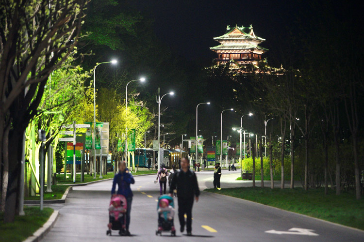 世园会园区中央的天田山顶上,永宁阁灯光璀璨。