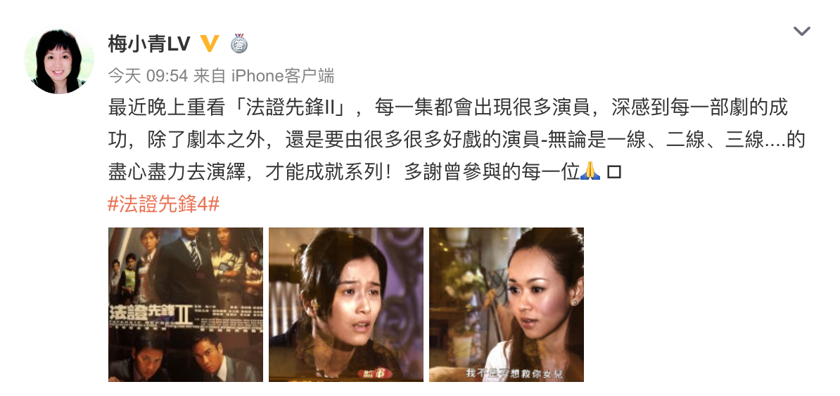 梅小青还在5月4日发微博表示,“最近晚上重看《法证先锋2》,每一集都会出现很多演员,深感到每一部剧的成功,除了剧本之外,还是要由很多好的演员,无论是一线、二线、三线……尽心尽力去演绎,才能成就系列!”