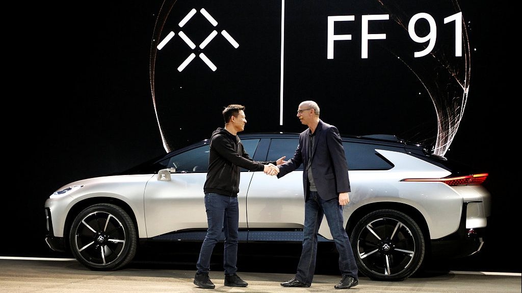 当地时间2017年1月3日,法拉第未来(FF)在CES大会上发布首款量产电动车FF91。 图片来源:视觉中国
