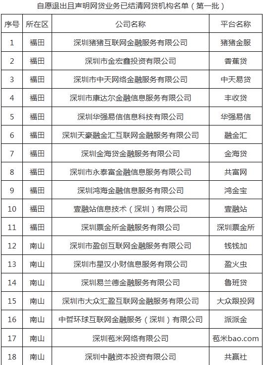 1、深圳市互联网金融风险专项整治工作领导小组办公室关于发布深圳市P2P网络借贷风险专项整治第一批自愿退出且声明网贷业务已结清网贷机构名单的通知