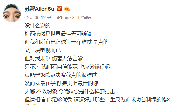 歌手苏醒平时酷爱打篮球,同时也是巴萨球迷,梅西在他心中是“世界最佳球员”。今晨巴萨被利物浦逆转后,苏醒难以抑制失望的心情,做出了怒砸电视的冲动行为,“一块电视而已,对我来说,(巴萨出局的)伤害无法言喻。”