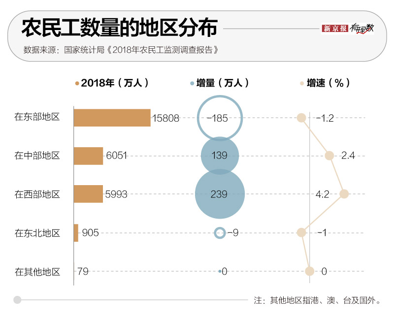 虽然东部地区的农民工数量仍以15808万人居高,但东部的吸引力其实在下降,2018年输入东部地区的农民工比2017年少了185万人,呈现负增长。