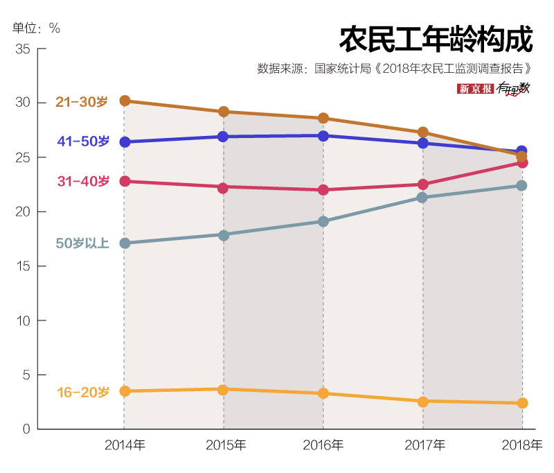 与此同时,青年农民工们所占的比例在逐年下降。