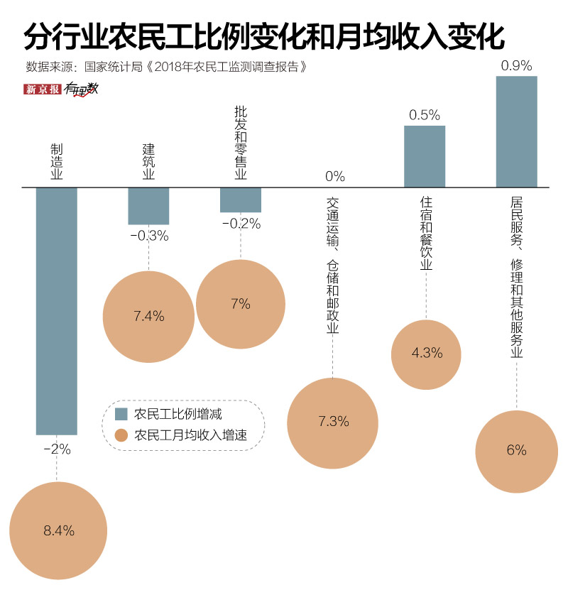 从事制造业、建筑业的民工比重都在2018年进一步下滑,尤其是制造业。