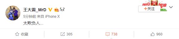 新京报讯(记者 周萧)中超本轮焦点战在今晚打响,上海上港主场2比1战胜山东鲁能。但这场补时长达11分钟的比赛充满争议,鲁能门将王大雷赛后在个人社交媒体上发了四个字表达感受:“太欺负人。”