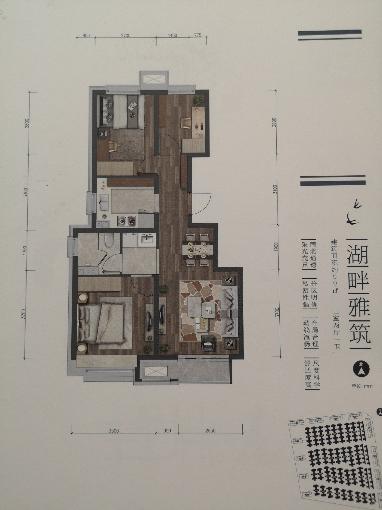 具体到户型本身,90平方米的户型是三居两厅一厨一卫设计,居住功能齐全,收纳考虑充分,符合三口之家或三代同堂需求。南北通透,主卧和客厅朝南,两个次卧朝北,其中一次卧面积在6.3平方米左右,略显局促。厨房U字形设计,动线合理。卫生间干湿分离,同时间段方便多人使用,但是进出主卧需要经过卫生间,多显不便。