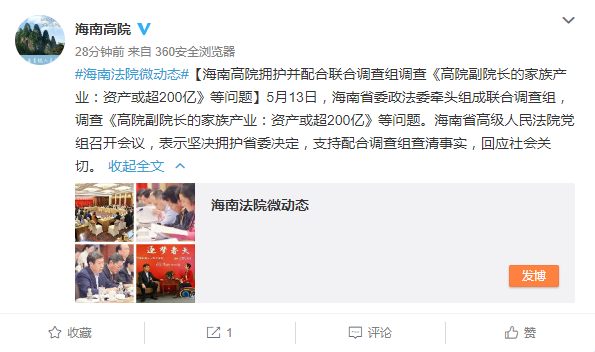 原标题:海南高院拥护并配合调查“高院副院长家族产业或超200亿”等问题
