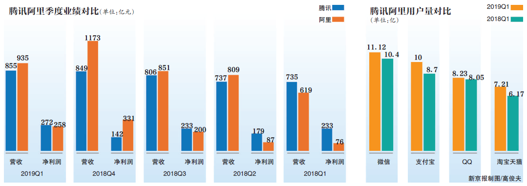 5月15日,腾讯发布了2019年第一季度财报,当季营收854.7亿元(人民币,下同),同比增长16%;净利润272.1亿元,同比增长17%。随后,阿里巴巴集团也发布2019财年第四季度(2019年1月1日-2019年3月31日)财报及2019财年业绩。当季收入达934.98亿元,同比增长51%。