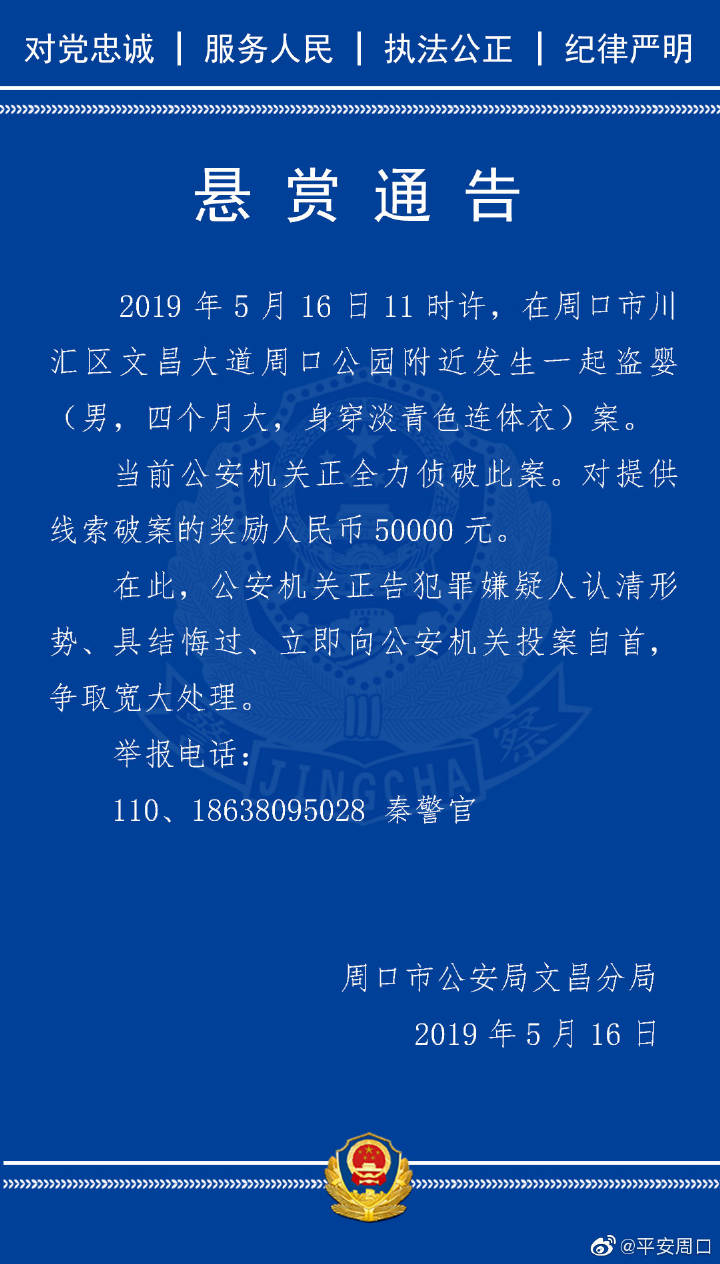新京报快讯 据河南省周口市公安局官方微博消息,5月16日,河南省周口市发生一起盗婴案。当日,周口市文昌分局接一群众报警称,其妻子带着四个月大的男婴在周口市川汇区文昌大道周口公园对面绿化带中间小路上散步时晕倒(患有低血钾病,有晕倒史),醒后发现孩子失踪。周口警方接警后立即对该事件展开侦破工作。随后又在其官方微博发布了针对该事件的悬赏公告,对提供线索破案的予以五万元奖励。