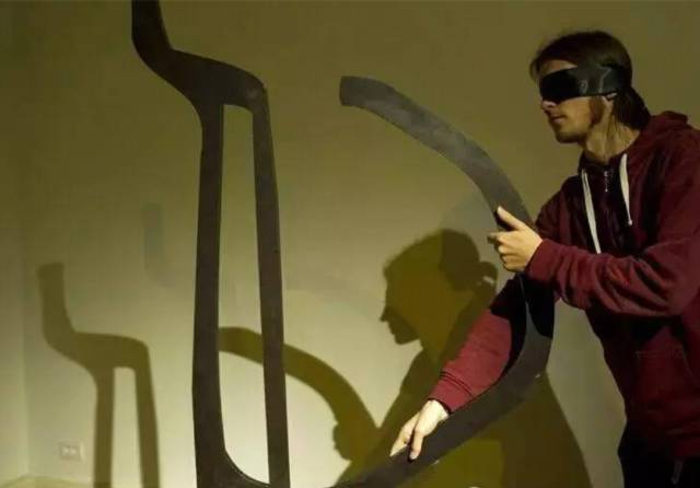 参观者正以盲人的方式触摸和感受博物馆内的一件雕塑艺术展品