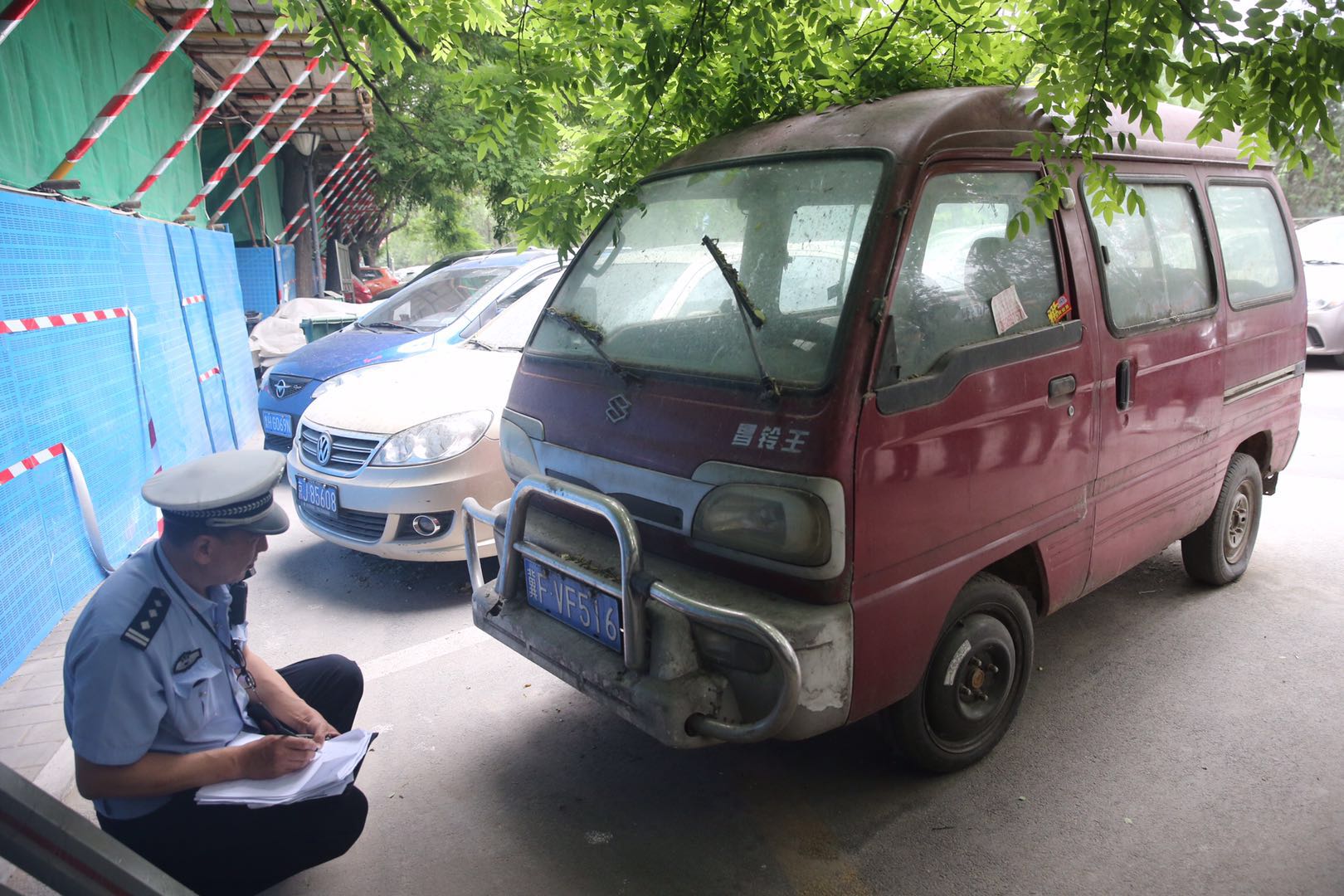 昨日,丰台区,民警正在对一辆“僵尸车”进行登记。新京报记者 王贵彬 摄