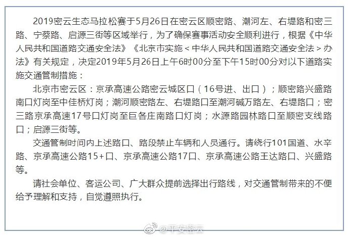 新京报快讯 21日,北京市公安局密云分局在其官方微博发布关于2019密云生态马拉松赛活动期间实施交通管制的通告。