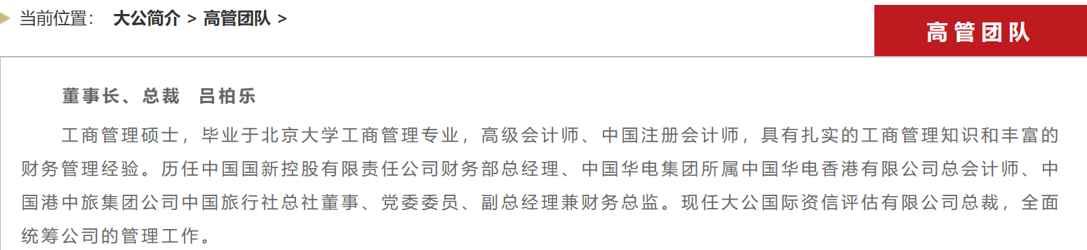 简历最后显示,吕柏乐现任大公国际资信评估有限公司总裁,全面统筹公司的管理工作。