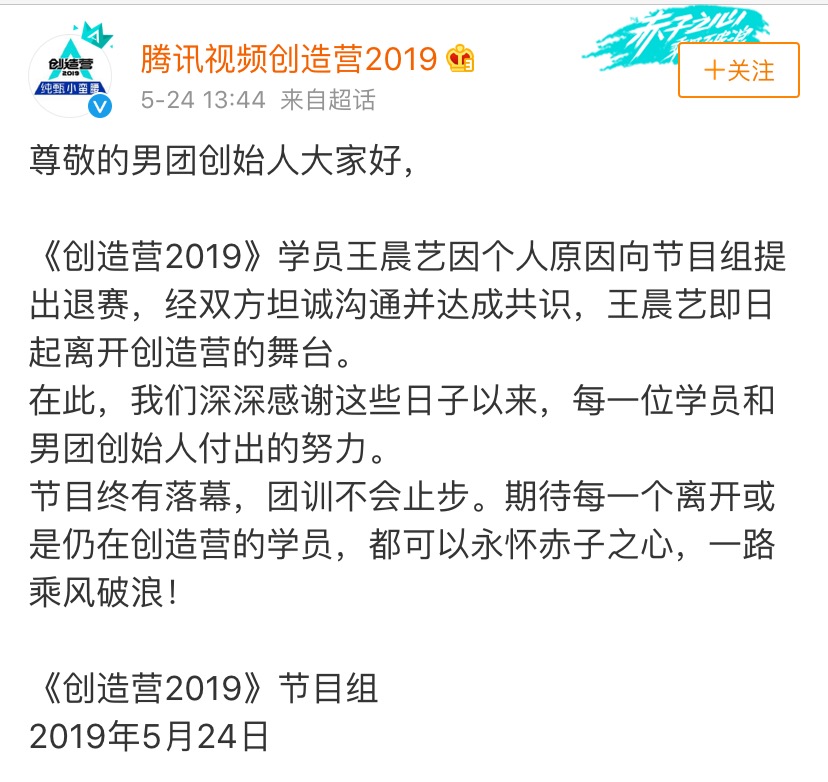 新京报讯(记者 武芝)5月24日,《创造营2019》官博发文宣布王晨艺退赛,称“《创造营2019》学员王晨艺因个人原因向节目组提出退赛,经双方坦诚沟通并达成共识,王晨艺即日起离开创造营的舞台。”