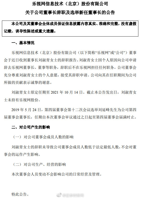 据证券时报消息 5月24日,乐视网发布公告,刘淑青辞任乐视网董事长、董事等职务,辞职后不在乐视网担任任何职务,原定任期至 2021 年 10 月 14 日。选举刘延峰先生为公司第四届董事会董事长。
