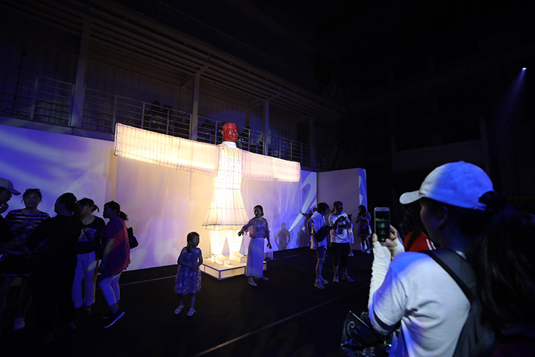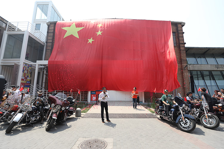 萨克斯手吹响《我爱你中国》主题曲,一面巨大的五星红旗缓缓沿墙体展开。