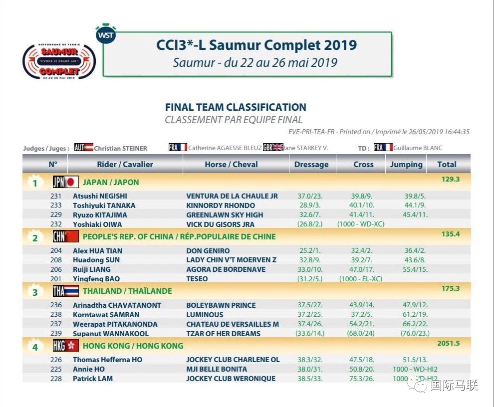 比赛中,前两位出场的中国搭档梁锐基/阿果木以及孙华/Lady Chin总共拿到12个罚分,总罚分99分。在中国队最后一对搭档华天、堂·热内卢出场前,3位日本骑手已经结束比赛,总计收获8个障碍罚分。日本队的最终罚分为129.3,排名所有参赛队第一。