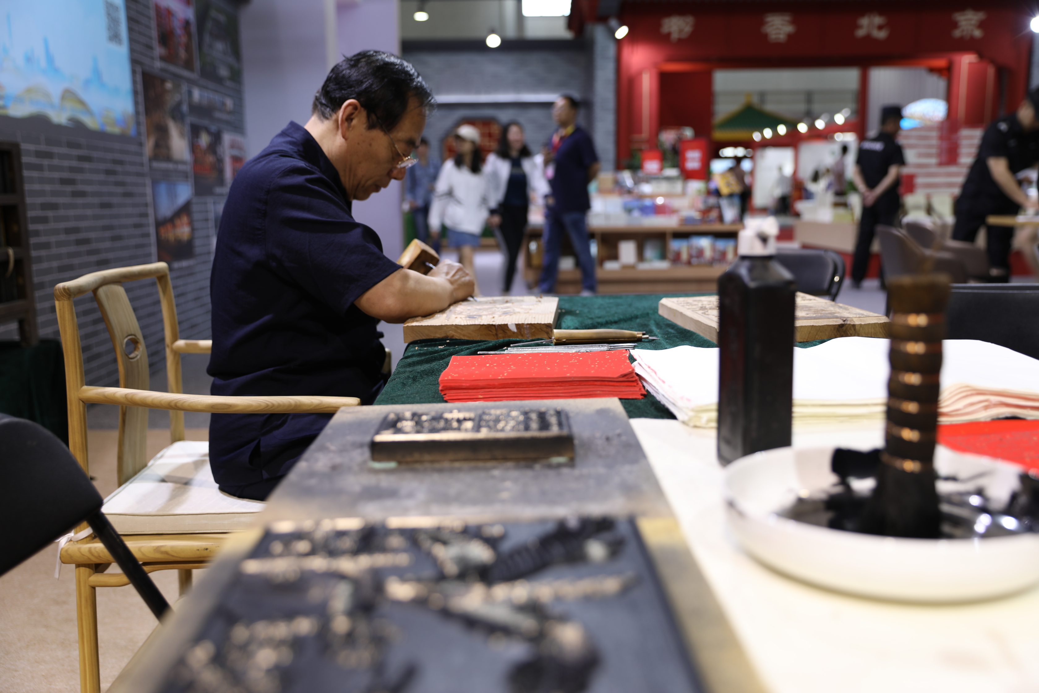 木版年画传承人现场演示刻制版画。北京发行集团供图