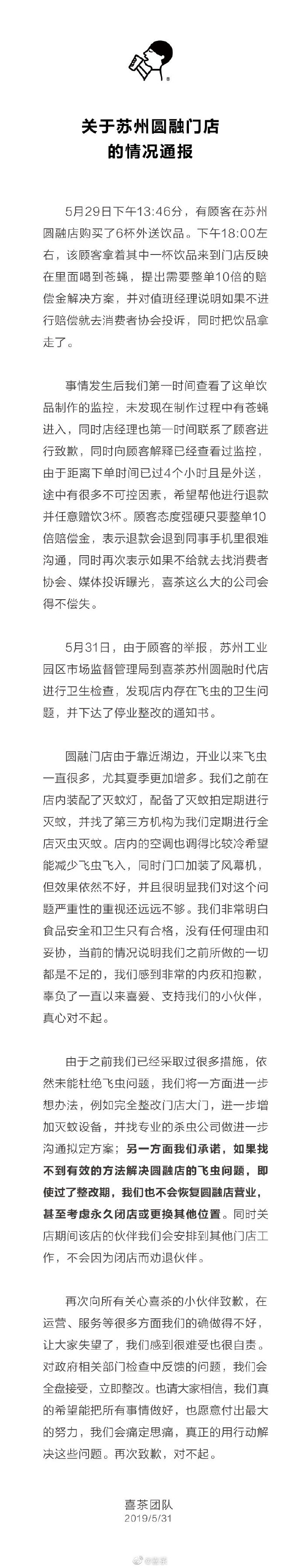 新京报快讯 今日(31日)喜茶在其官方微博发布“关于苏州圆融门店的情况通报”,以下为通报全文: