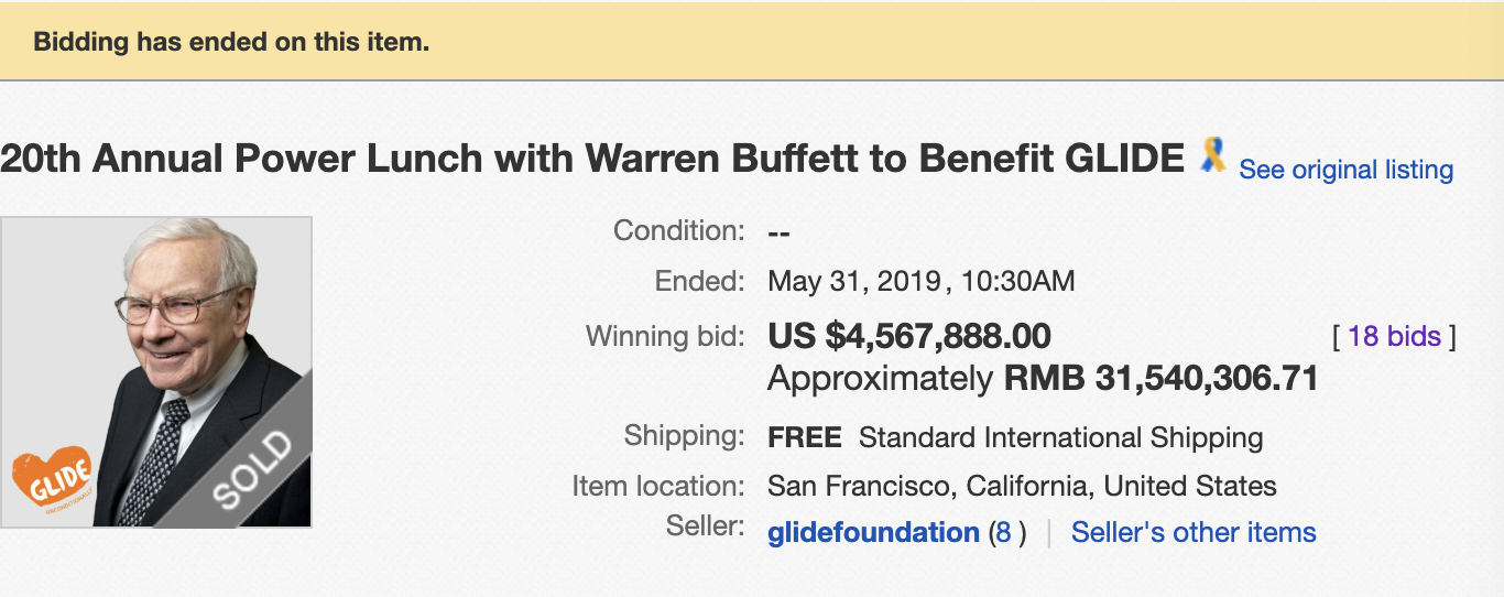 巴菲特慈善午餐在eBay网站上进行拍卖,今年的拍卖时间为太平洋夏季时间2019年5月26日19:30起至2019年5月31日19:30止(即北京时间5月27日10:30至6月1日10:30)。起拍价格为2.5万美元,与往年相同。