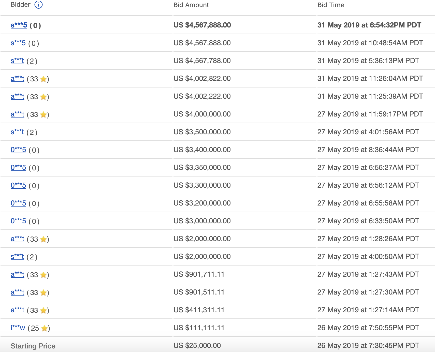 eBay网站显示,此次拍卖共经历18轮叫价。根据规则,每次叫价需加价至少100美元,但第一位竞拍者直接从2.5万美元提升到11.11万美元,此后多位竞拍者迅速拉高价格。竞拍者“s***5”在5月31日以相同价格4567888美元叫价两次,最终以高出上一名叫价者100美元的优势夺下今年与巴菲特共进午餐的机会。