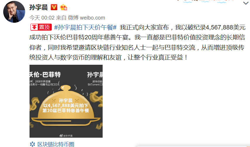 6月4日凌晨,波场创始人、“马云最年轻门徒”孙宇晨在其个人微博中证实此前的传闻,他以破纪录的456.7888万美元(约合人民币3153万元)价格拍下巴菲特20周年慈善午宴。他表示,自己一直都是巴菲特价值投资理念的长期信仰者,同时他公开邀请区块链行业知名人士一起与巴菲特交流。