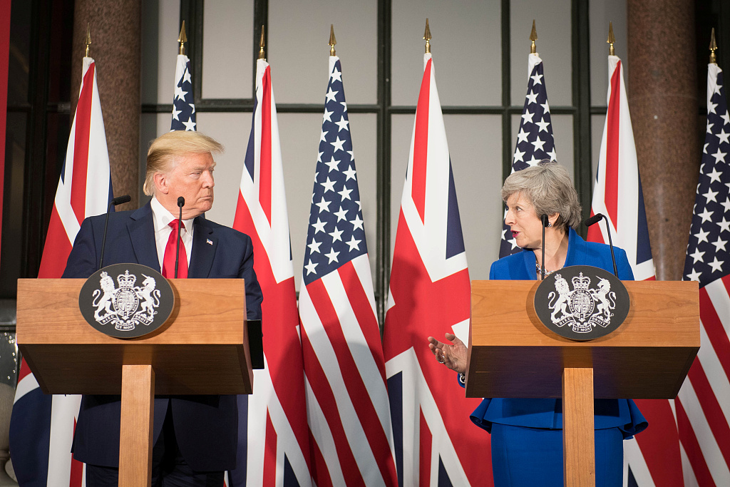 对英国事访问第二天,特朗普与特雷莎·梅进行会谈,并在会谈后召开联合记者招待会。特雷莎·梅表示,她和特朗普就安全和经济领域合作等问题进行了磋商,同时就双方存在分歧的一些议题,如伊核问题、气候变化问题交换了意见。特雷莎·梅称,她与特朗普只是两国“珍贵而深远友谊的最新守护者”。