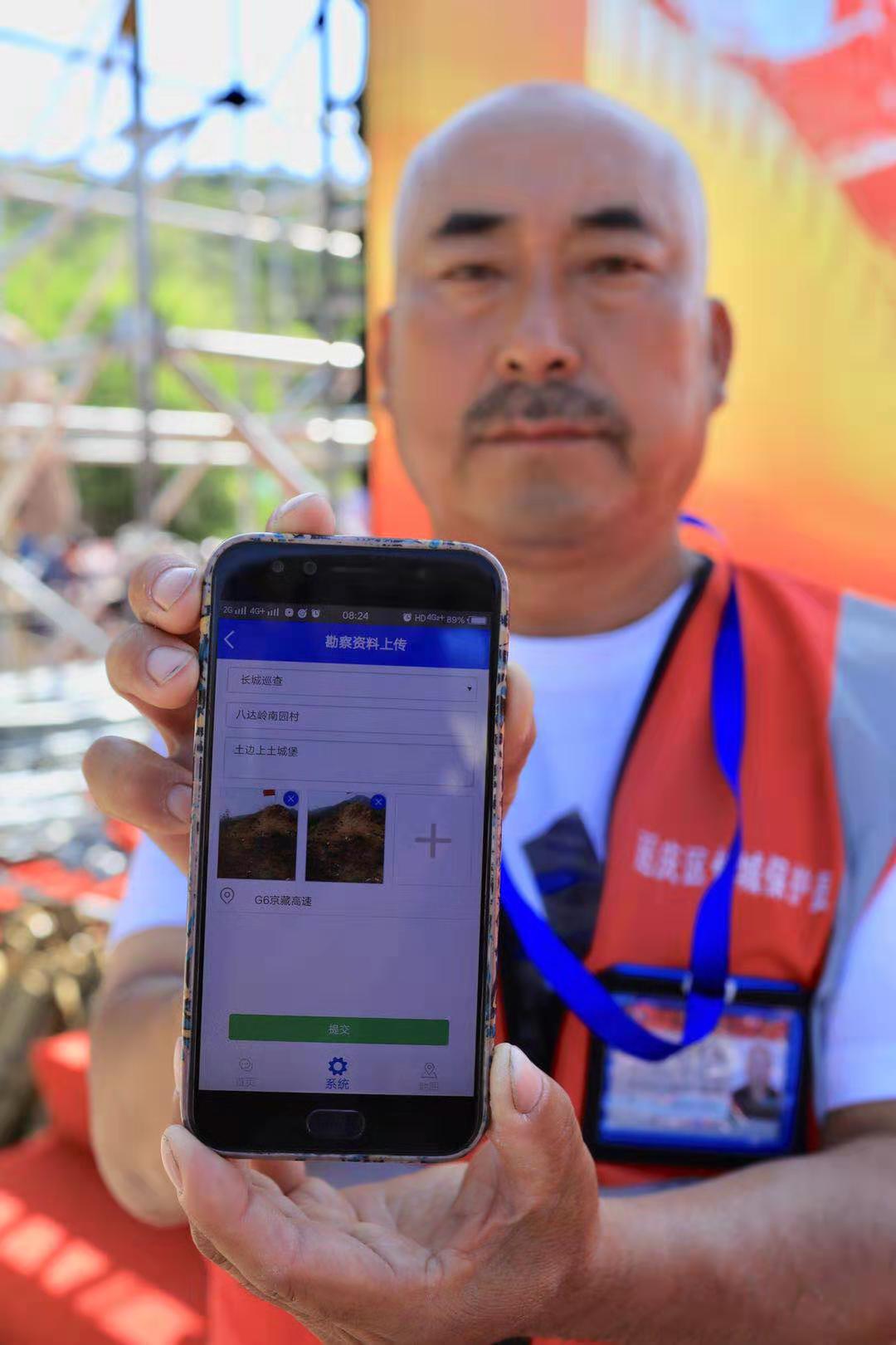 延庆区长城保护员展示用APP上传巡视图片。摄影/新京报记者 浦峰
