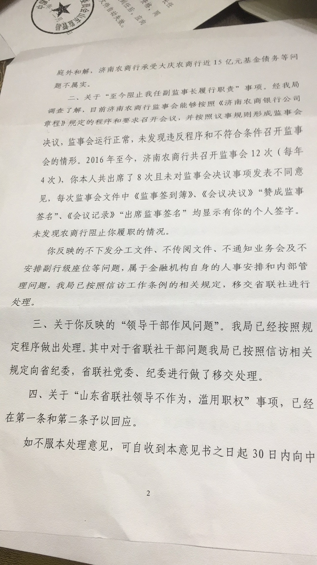 据彭博提供的山东银保监局出具的《信访事项处理意见书》显示,2019年2月11日、12日,该局接到彭博反应的信访材料后,组织相关部门,对法定工作职责内的事项进行了调查核实,对超出职责范围事项按规定进行了相应处理。