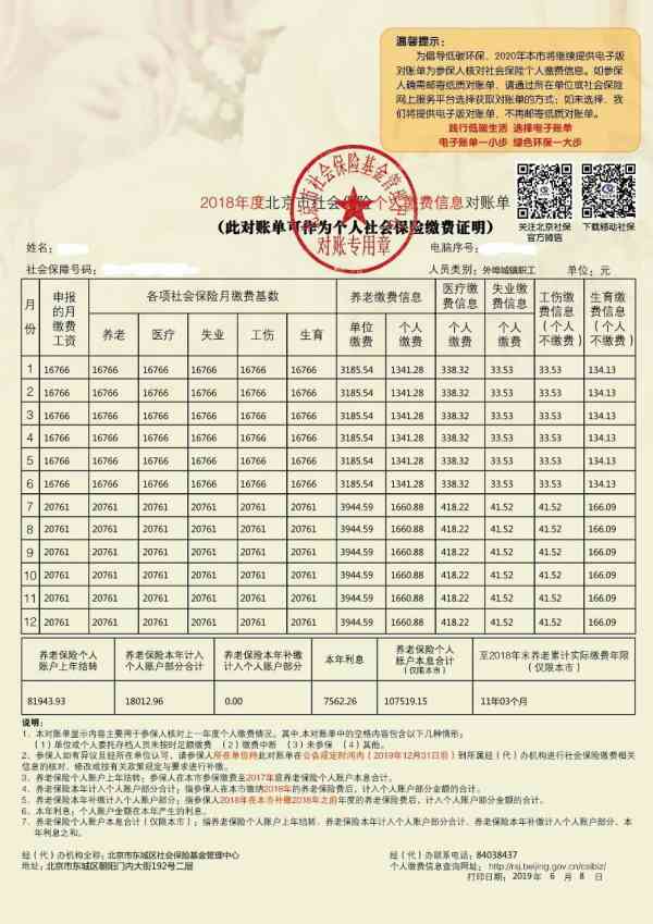 2018年度社保对账单。来源:北京日报