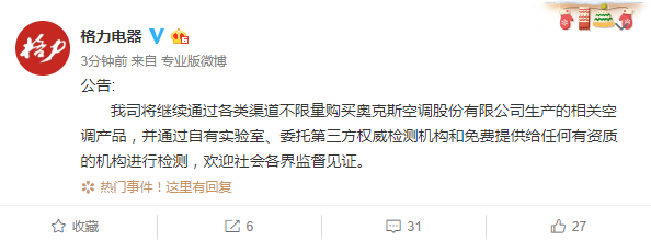 格力:将继续通过各类渠道购买奥克斯空调产品并进行检测