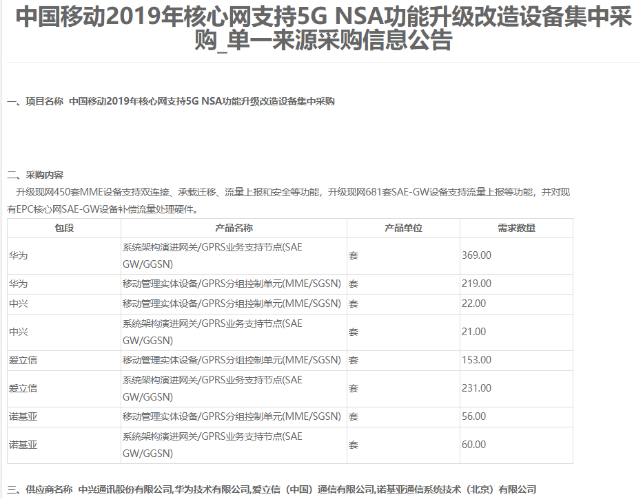 新京报讯(记者 陆一夫)近日,中国移动公布《2019年核心网支持5G NSA功能升级改造设备集中采购单一来源采购信息公告》,华为、中兴、爱立信和诺基亚成功中标,其中华为的中标数量最多,是此次5G采购大单的赢家。