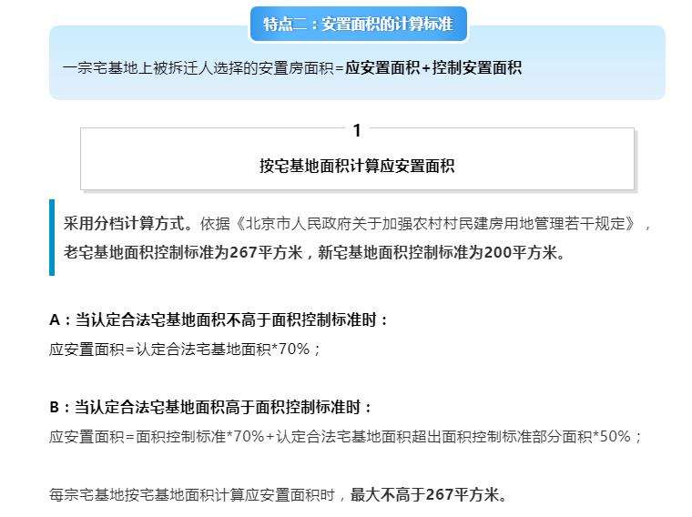 一宗宅基地上被拆迁人选择的安置房面积等于“应安置面积”加上“控制安置面积”。按安置人口数计算“应安置面积”时,原则人均选择45平方米。但长期在此居住、未享受过征收、拆迁安置且本市范围无商品房及各类政策性住房的安置人员可享受人均50平方米安置面积。超出宜居人口数外的安置人员可享受人均30平方米的安置面积。